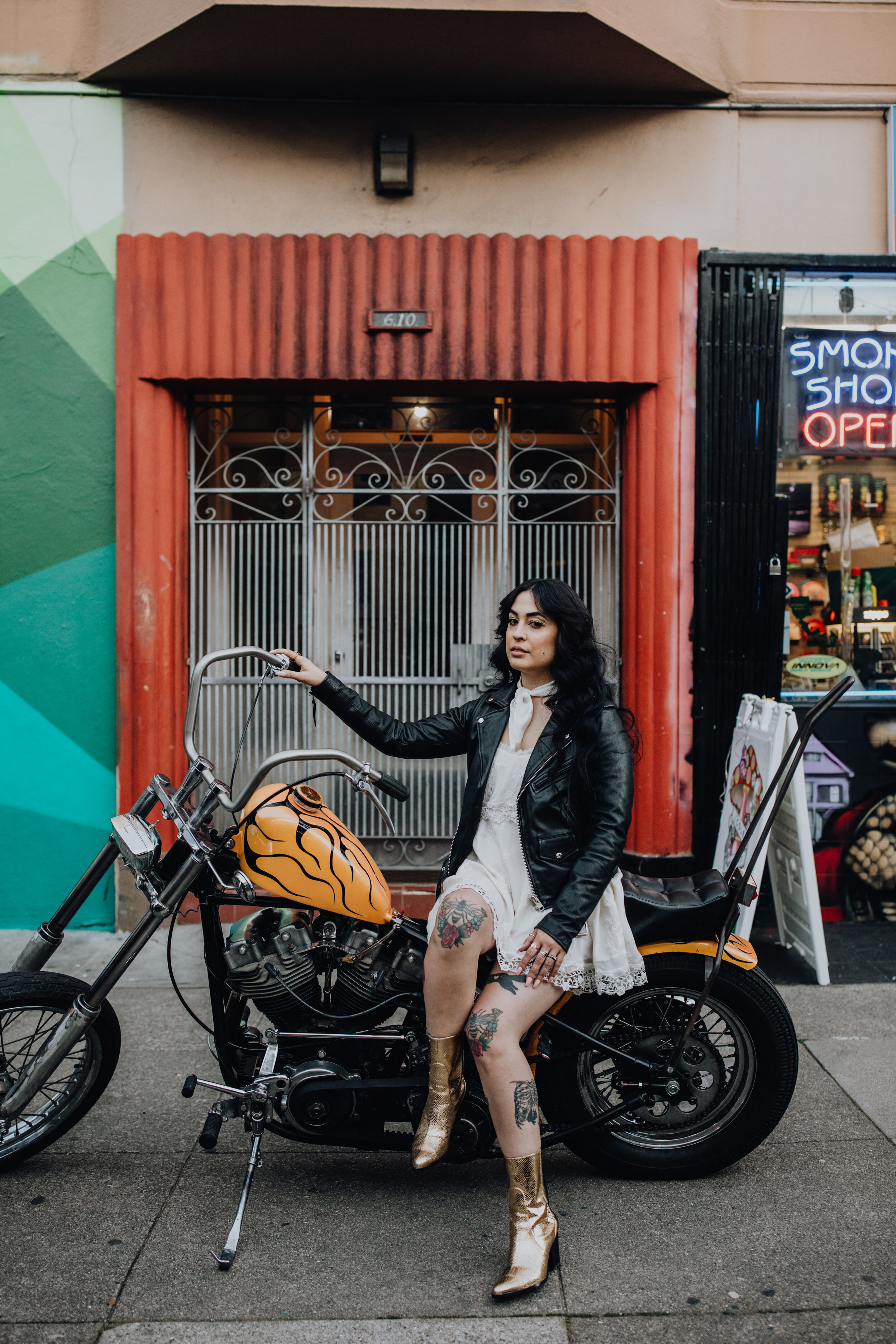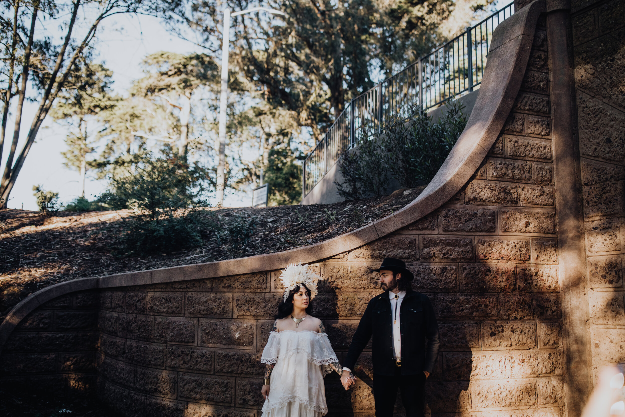 Stylist: Feather And North | MUAH: DA Bridal | Dress: Daughters of Simone | Bridal Boots: Zara | Location: Haight-Ashbury District | Host: Evolve Workshops | Floral: Beijaflor Botanicals | Jewelry: Opal Milk | Paper Goods: Dear Darling Weddings Neck Scarf: I’m With The Band